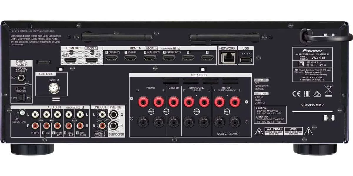 Le VSX-935 est compatible avec la confi guration 5.2.2 de la toute dernière plateforme sonore de cinéma, Dolby Atmos®. Vous pouvez reproduire le son du movement des objets de manière fl uide et réaliste, ou le mouvement tridimensionnel réaliste aérien par les haut-parleurs supérieurs. D’autres codecs audio tels que PCM et DSD peuvent être mélangés à l’aide de Dolby Surround pour profi ter du son surround 3D.