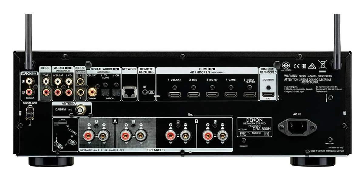 Le DRA-800H dispose de 5 entrées et 1 sortie HDMI qui prennent en charge la vidéo 4K UHD 60Hz, le sous-échantillonnage 4:4:4 Pure Color, Dolby Vision, High Dynamic Range (HDR10), Hybrid Log-Gamma (HLG), ARC, 3D et le passthrough BT.2020 pour un rendu couleur, clarté et contraste exceptionnel.