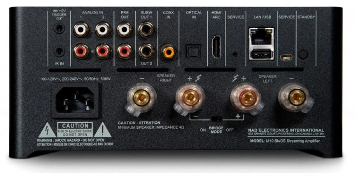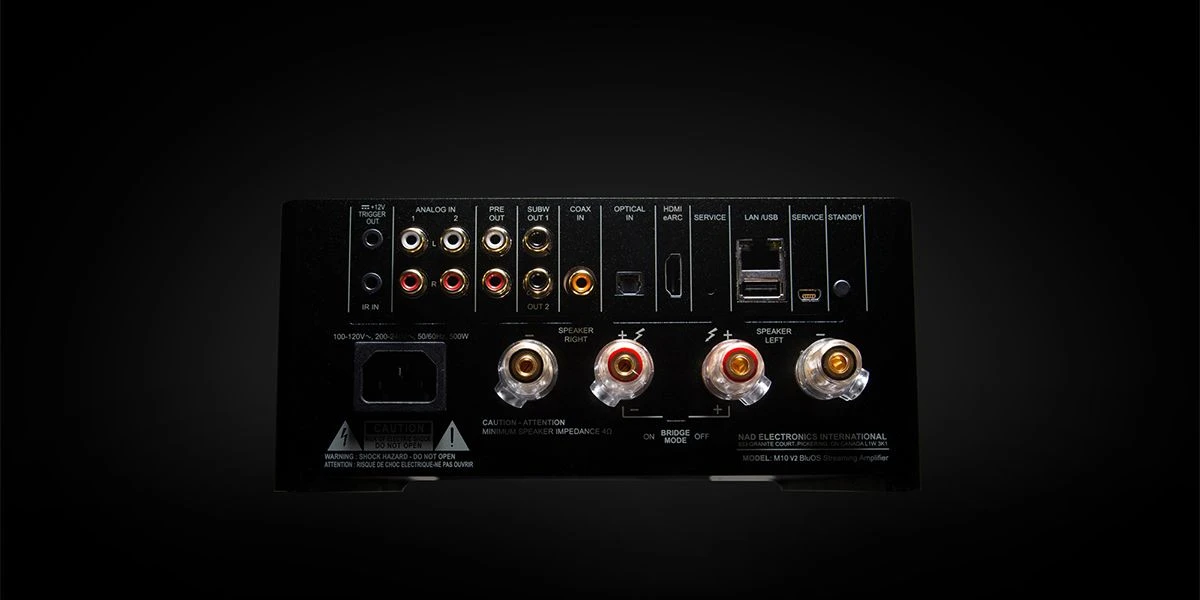 Comme le M10 original, le M10 V2 est l’exemple même de la révolution hi-fi “Just Add Speakers”. Mais il fait un pas de géant dans cette révolution. Outre les bornes de haut-parleurs de qualité audiophile, il dispose de deux prises pour caisson de basses indépendantes, dont les paramètres de sortie sont réglables à partir de l’application BluOS . Le M10 V2 ajoute le décodage du son surround Dolby Digital. Les amateurs de cinéma à domicile peuvent configurer une paire de haut-parleurs ou d’amplificateurs sans fil compatibles avec le Dolby Digital Surround BluOS pour lire les canaux Surround, tandis que les haut-parleurs principaux gèrent les canaux avant, de sorte que le M10 V2 sert de plaque tournante dans une installation Dolby Digital Surround à 4.1 ou 4.2 canaux. Le M10 V2 transmet les canaux arrière sans fil, avec une très faible latence, de sorte que vous n’avez pas besoin de faire courir des fils dans votre pièce pour connecter les enceintes surround.