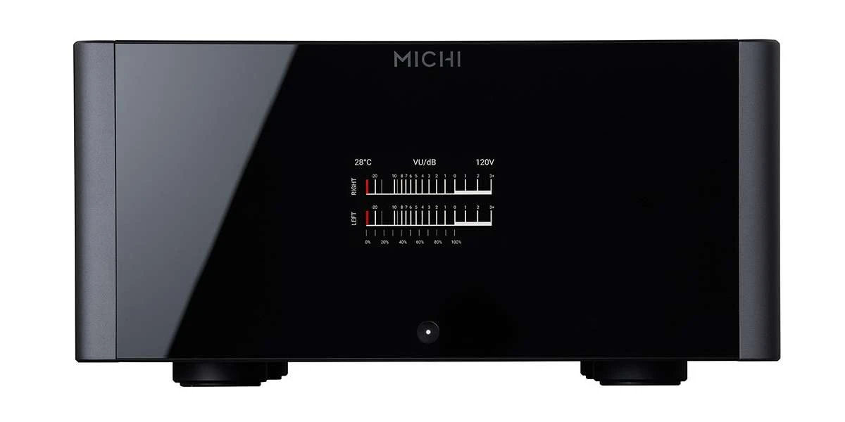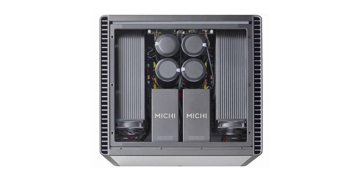 L’amplificateur de puissance stéréo Michi S5 est un amplificateur linéaire de premier ordre qui affiche 500 watts en classe AB sous 8 ohms et plus de 800 watts sous 4 ohms. Le double bloc monophonique est équipé de deux transformateurs toroïdaux colossaux de 2 200 VA conçus sur mesure et fabriqués par nos soins. Ils sont logés dans des compartiments autonomes remplis d’époxy éliminant bruits et vibrations. Le banc de quatre condensateurs britanniques brevetés de grande capacité totalisant 18 000 µF produit des basses exceptionnelles tout en préservant les détails les plus fins et en maîtrisant les 32 transistors de sortie à haute capacité, vous garantissant sans peine un rythme et un synchronisme justes, même dans les conditions de charge les plus difficile.