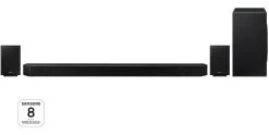 Les enceintes arrières sans fil Samsung incluses permettent à l’aide des haut-parleurs verticaux d’avoir un son tridimensionnel. Le son est reflété sur le plafond, offrant un son aérien à couper le souffle, apportant ainsi l’expérience du cinéma directement chez vous.