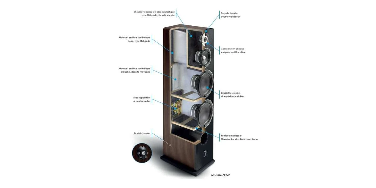 Un soin particulier a été apporté au coffret de l’enceinte. La façade est constituée de deux matériaux denses et épais, rigidifiée par de nombreux renforts internes. Le filtrage à pente raide fait appel à des composants audiophiles d’excellente qualité. Quant à la finition, elle n’est pas en reste avec un vinyle d’excellente qualité et une façade laquée.