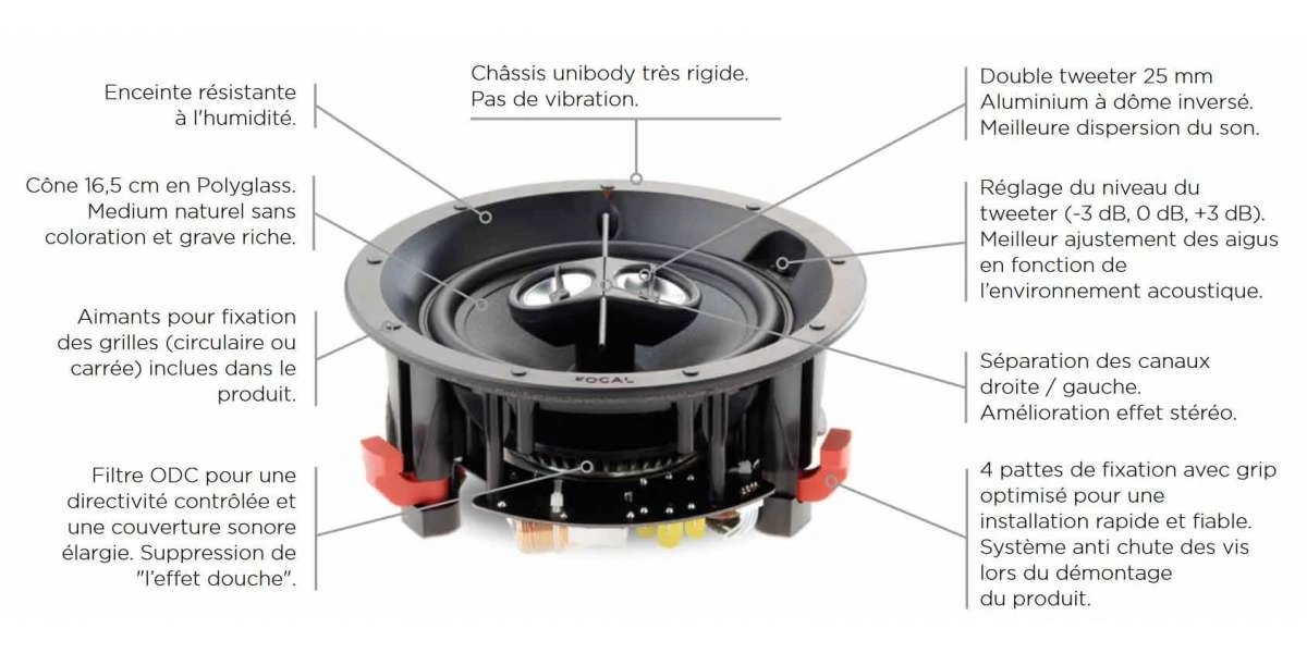 100 ICW5, 100 ICW6 et 100 ICW8, 100 IC6ST et ICLCR5 proposent un correcteur à 3 positions (-3 dB, 0 dB, + 3 dB) pour égaliser l’aigu en fonction de l’acoustique de la pièce, ce qui améliore le rendu quel que soit l’environnement (réverbération sur les vitres ou le carrelage par exemple). Deux enceintes peuvent être connectées à un seul amplificateur.