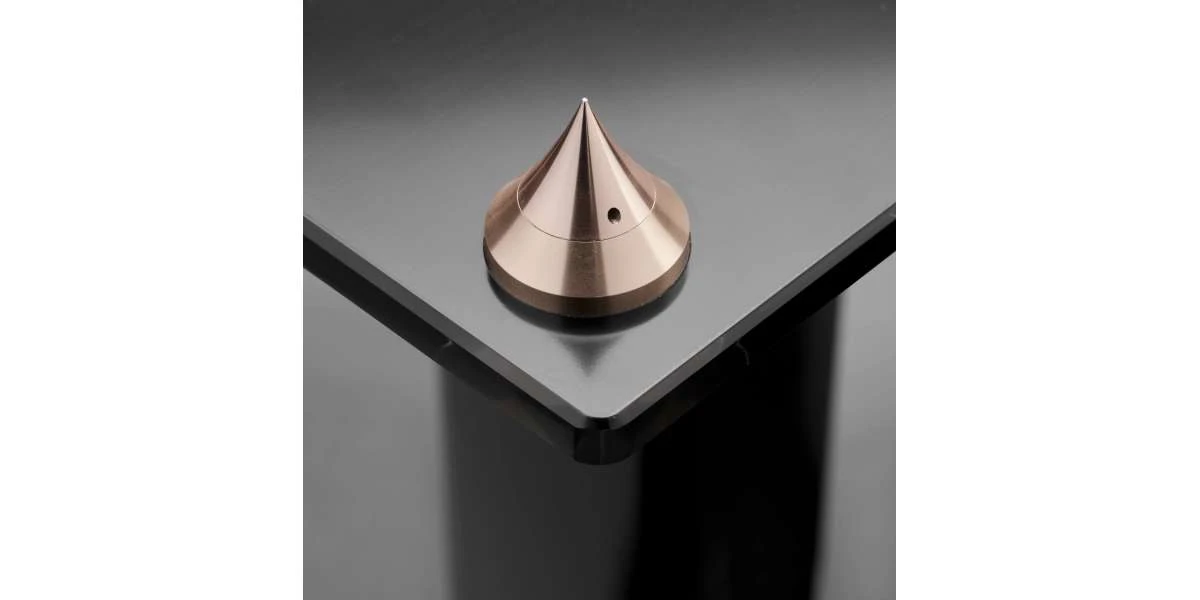 Ces supports sont munis d’un kit d’accessoires composé de deux jeux de pointes de découplage : le premier ajustable en hauteur, en aluminium or rosé, fourni avec contre pointes pour des surfaces type moquette et le second en caoutchouc pour des surfaces plus rigides. Ces accessoires permettent un découplage de l’enceinte par une diminution conséquente des transmissions de vibrations parasites vers le sol et améliorent ainsi l’expérience musicale.