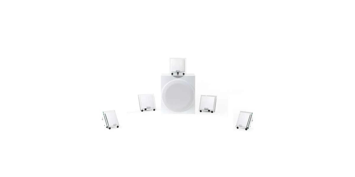 Configuration minimale requise pour une écoute multicanale, ajout d’enceintes surround complémentaires possible. Attaches murales fournies, pieds de sol disponibles en option. Coloris disponibles : noir ou blanc.