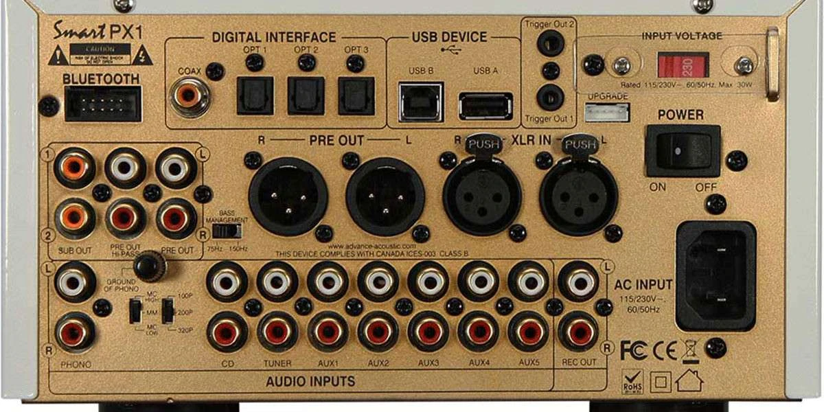 Rien n’a été oublié, chaque entrée a été peaufinée dans le but ultime d’obtenir une restitution musicale au meilleur niveau. Le PX1 dispose ainsi de neuf entrées analogiques dont une entrée symétrique et une entrée phono paramétrable MM ou MC à double niveau. Le réglage de la capacitance de la cellule phono est paramétrable. Côté numériques, le PX n’est pas en reste, il dispose de trois entrées optiques numériques, une entrée numérique coaxiale, une entrée USB B (XMOS asynchrone) ainsi qu’une USB A. La conversion des signaux numériques est assuré par le fameux convertisseur Wolfson WM8740.