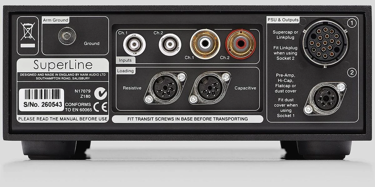 Les double prises BNC et phono assurent la polyvalence des entrées et l’ajustement en fonction de l’impédance de la cartouche est réalisé par quatre prises de charge résistives et trois prises de charge capacitives. En association avec la charge d’entrée interne du SuperLine, vingt combinaisons de charge standards différentes sont possibles.