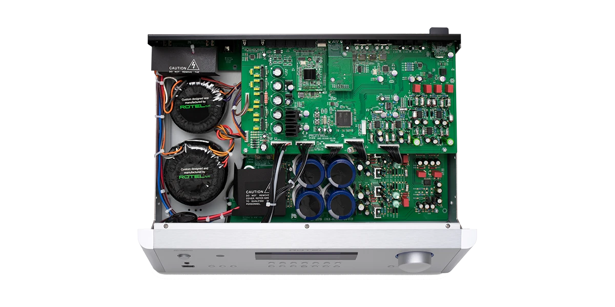 Le cœur du RC-1590MKII commence par l’alimentation électrique équipée de deux transformateurs toroïdaux. Les transformateurs sont isolés électriquement et physiquement, délivrant des tensions d’alimentation analogique et numérique dédiées à tous les circuits critiques via des condensateurs à fentes à faible ESR éliminant les distorsions indésirables et avec un bruit de fond extrêmement faible.